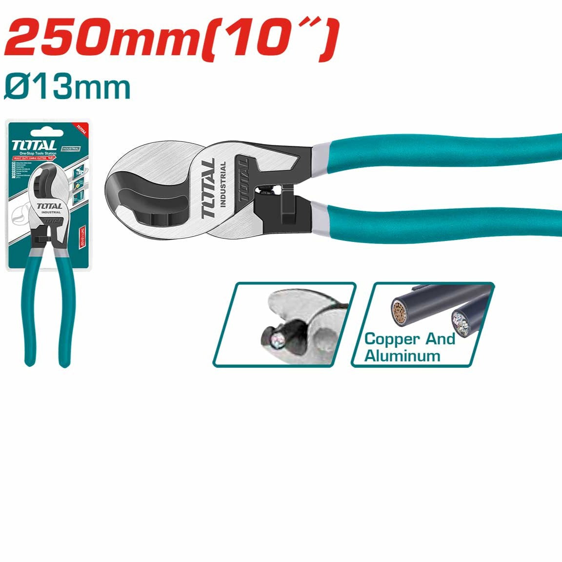កន្ត្រៃកាត់ខ្សែភ្លើង Total Cable Cutter 10" THT115102, Cutting capacity:13mm, Material Carbon steel, Size:10"/250mm, Range of application Copper and Aluminium cables, weight:0.489kg, Packed by half double