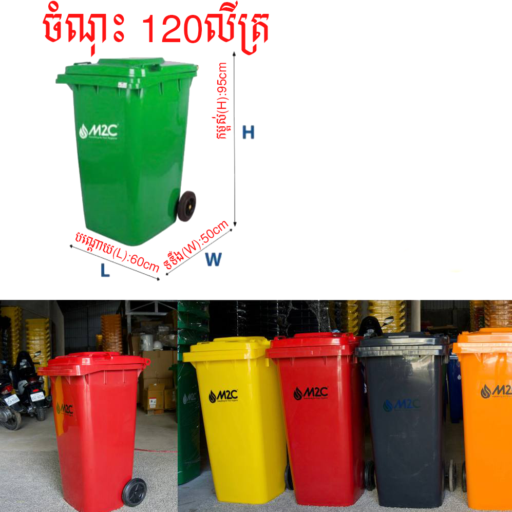 ធុងសំរាម M2C Waste Bin 120L, ធុងចំណុះ120លីត្រ, ប្រវែងៈ ប(0.6m)xទ(0.5m)xក(0.95m)