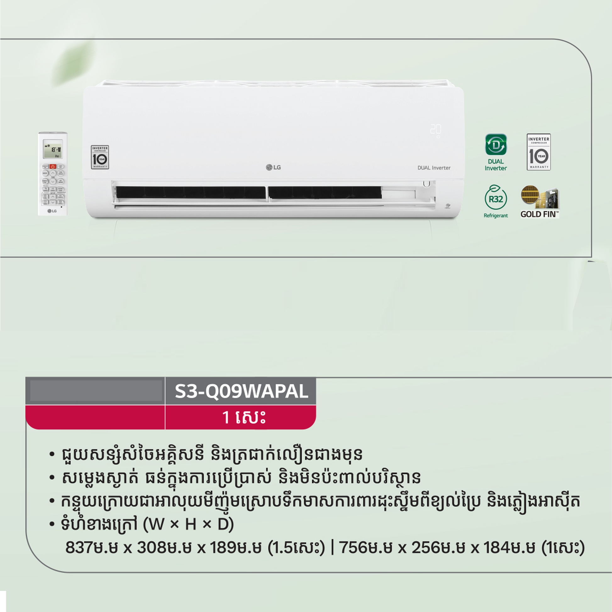 ម៉ាស៊ីនត្រជាក់ LG Air Conditioner Dual Inverter 1HP Q09WAPAL,